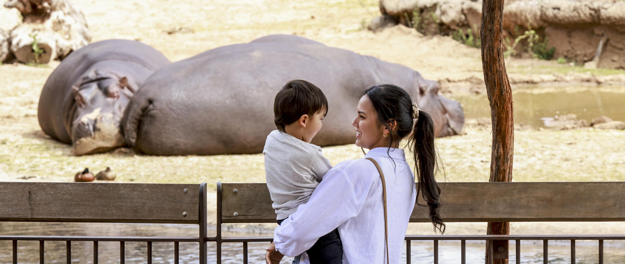 An Education Keeper, smiling to two students who are smiling back to her, on the Hippo Boardwalk with two Hippo's behind them.