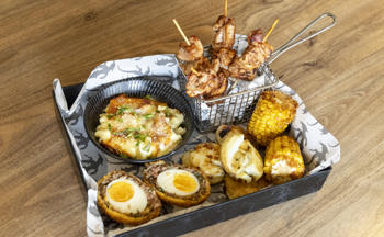 Viking Feast Platter for 2 (top middle): Flame chicken skewers, crispy scotch eggs, mac & cheese, BBQ corn and baked potato. Available from Lakeside Bistro