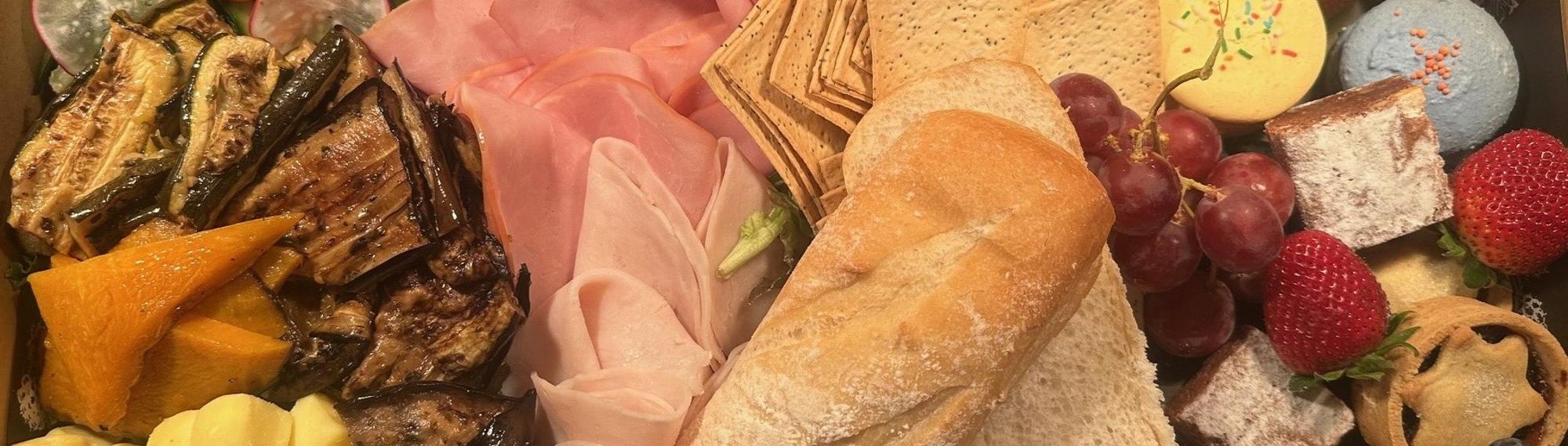 - Selection of cured meats, frittata, marinated grilled vegetables and olives, pickles, cheddar cheese, lavosh, grissini, fresh baguette, Xmas cookie, Xmas fruit mince tart, chocolate brownie bite and macaron.