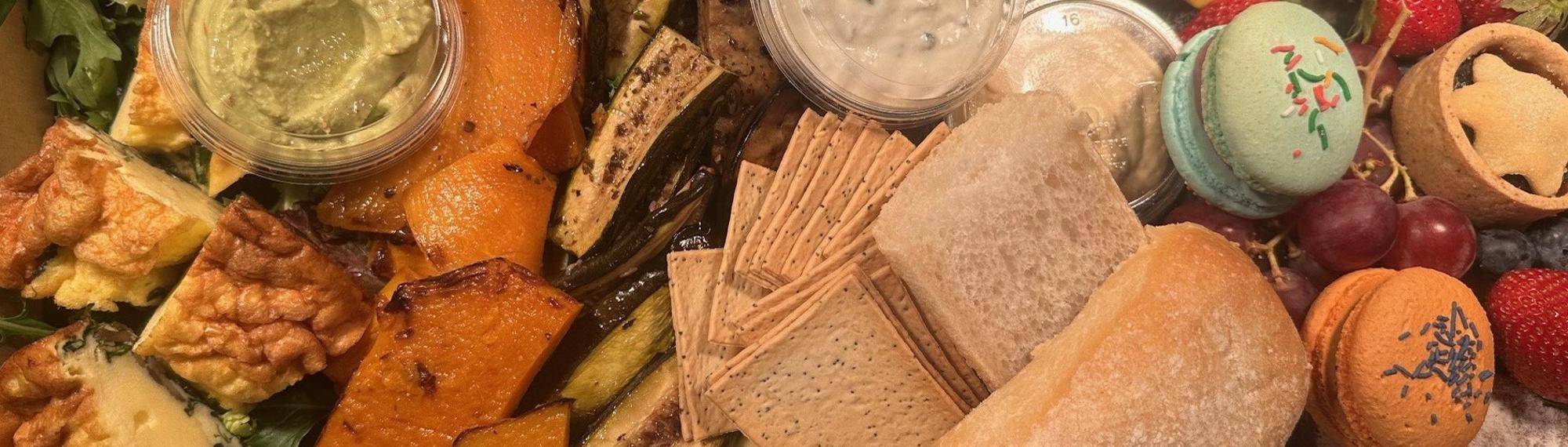 - Selection of home made dips, frittata, marinated grilled vegetables and olives, pickles, cheddar cheese, lavosh, grissini, fresh baguette, Xmas cookie, Xmas fruit mince tart, chocolate brownie bite and macaron
