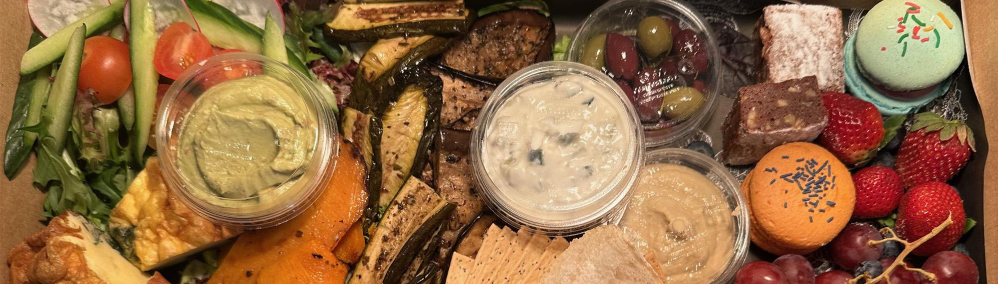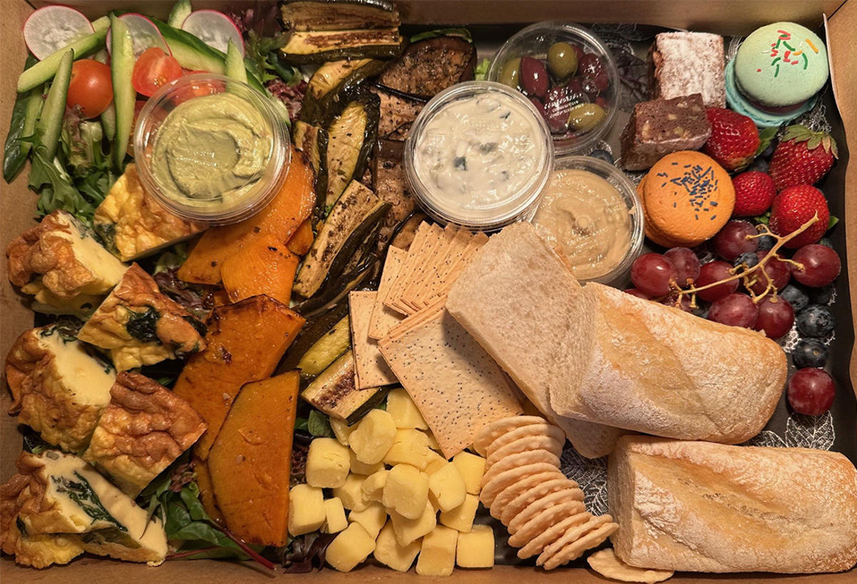 - Selection of home made dips, frittata, marinated grilled vegetables and olives, pickles, cheddar cheese, lavosh, grissini, fresh baguette, seasonal fruit, chocolate brownie bite and macaron.